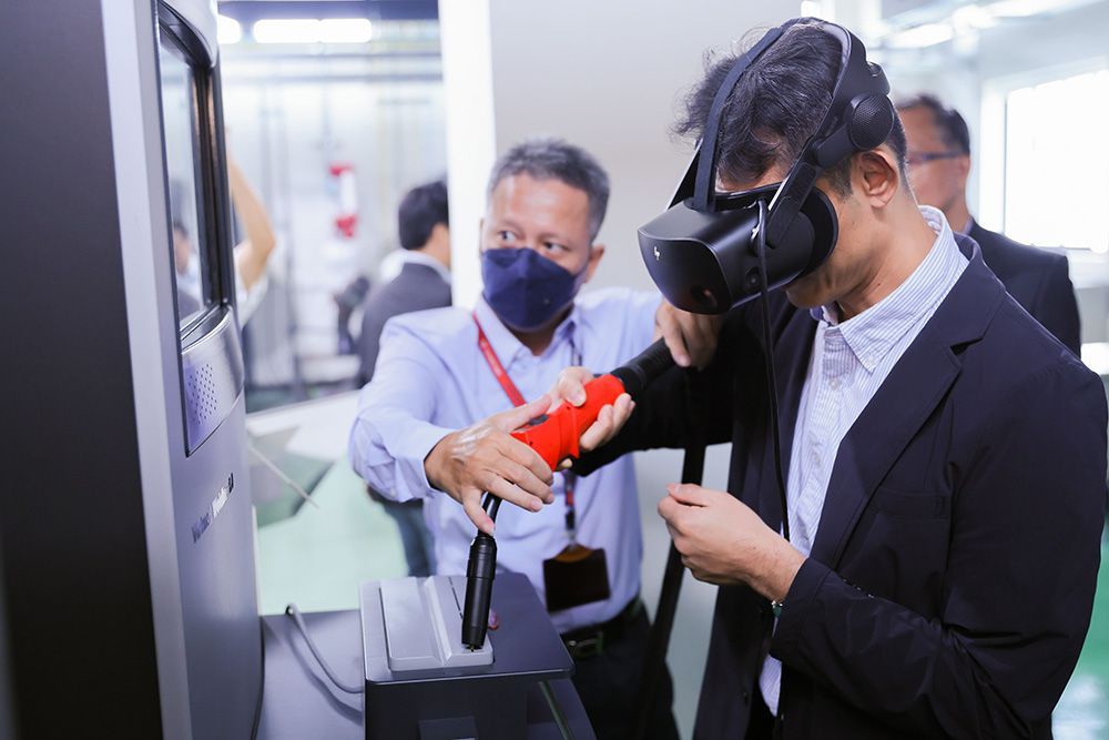 經濟部產業發展署郭肇中組長體驗 AR/VR銲接模擬訓練機。(圖片來源:自由時報)